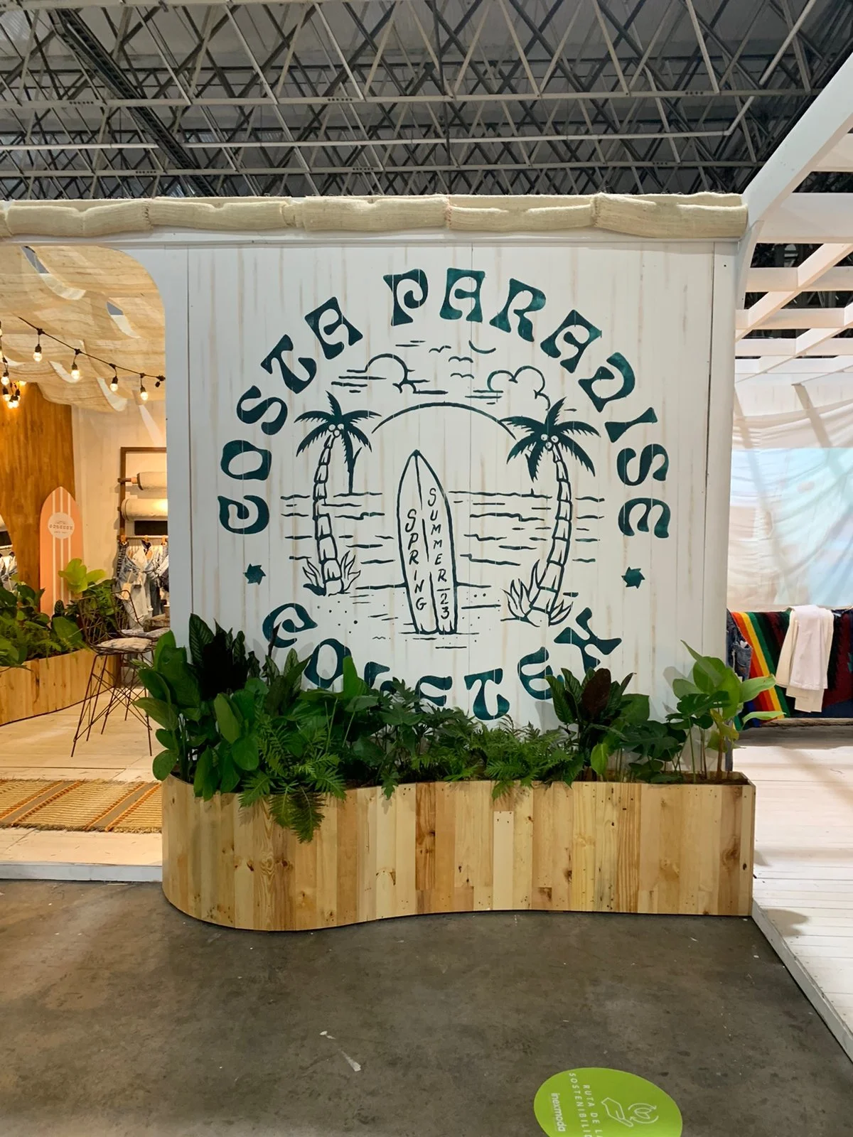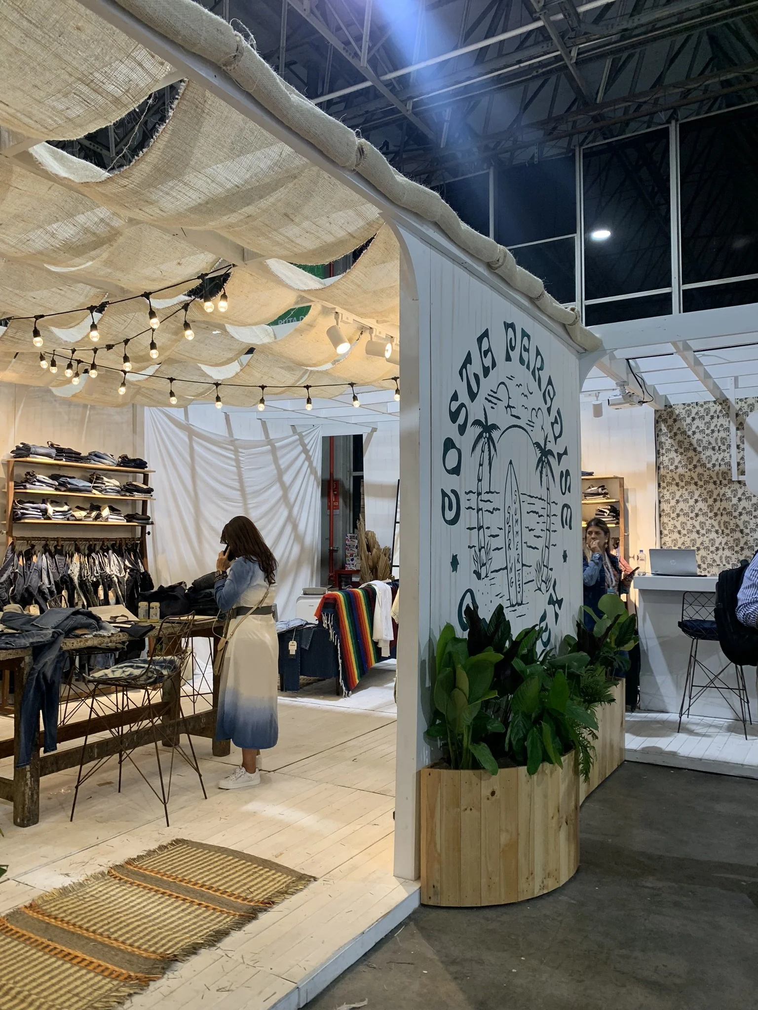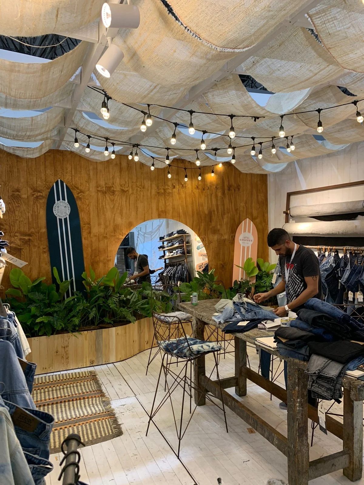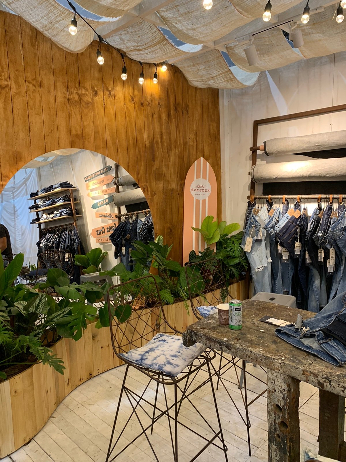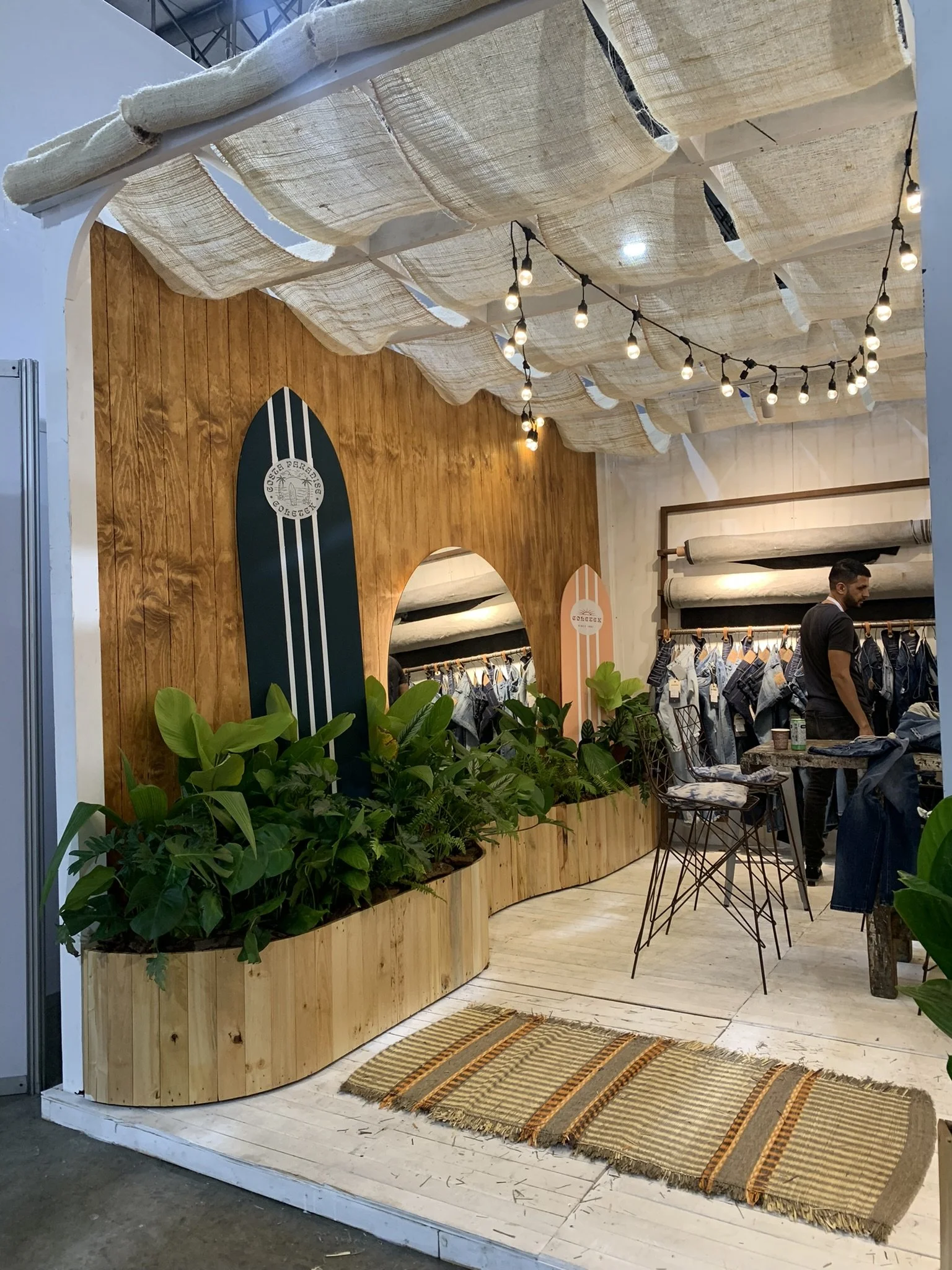 Un stand con aire de “Costa Paradise”: una cabina cálida y veraniega que mezcla madera blanqueada, telas crudas y mucha vegetación tropical para presentar el universo denim de Coletex. El cielo ondulado de yute y las guirnaldas de bombillos crean una luz suave tipo atardecer, mientras el espejo circular y las tablas-gráfica de surf enmarcan la exhibición de telas y prendas. Todo respira artesanía y verano.
