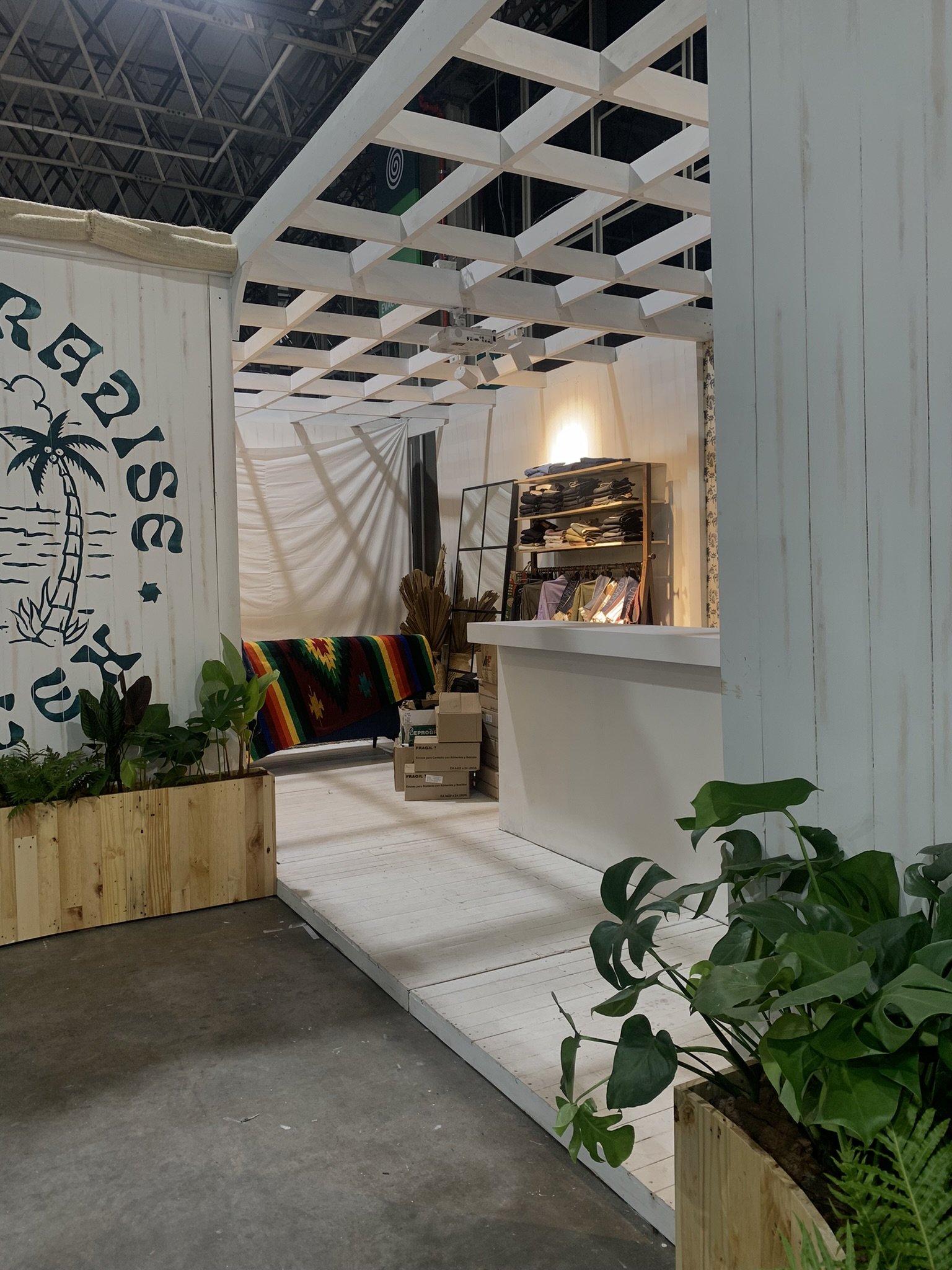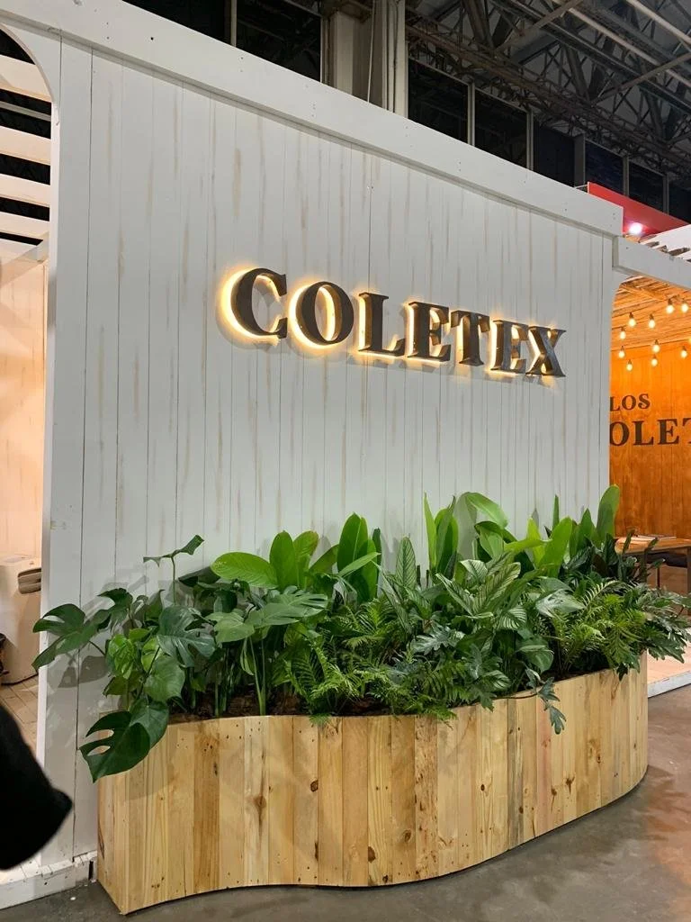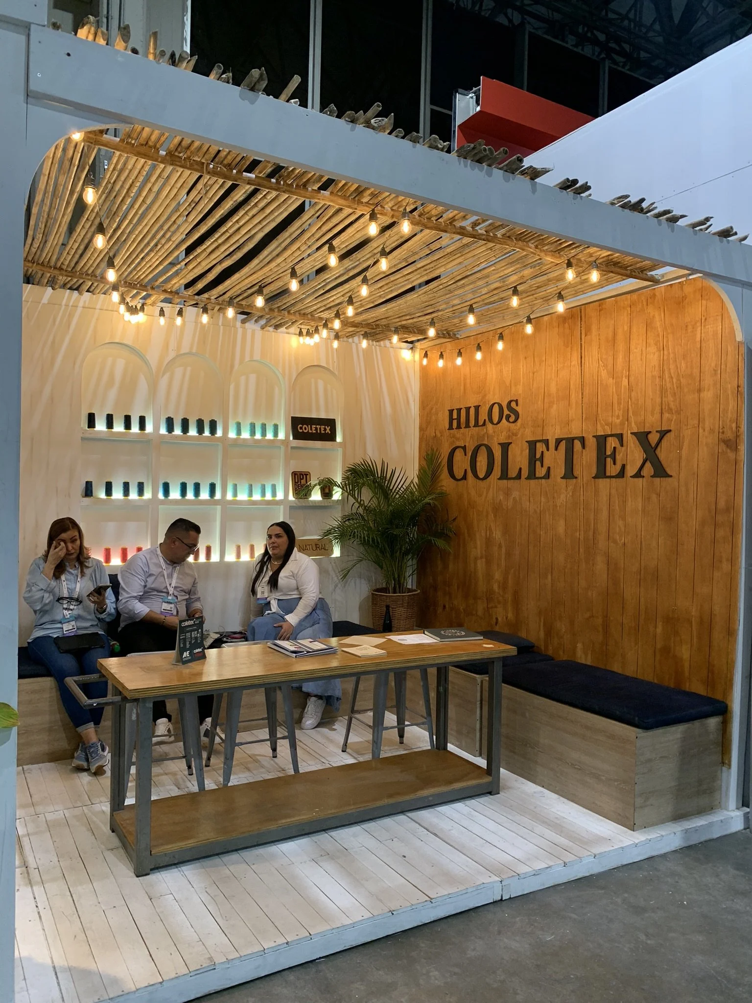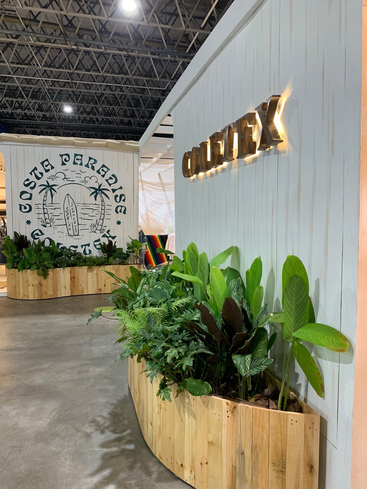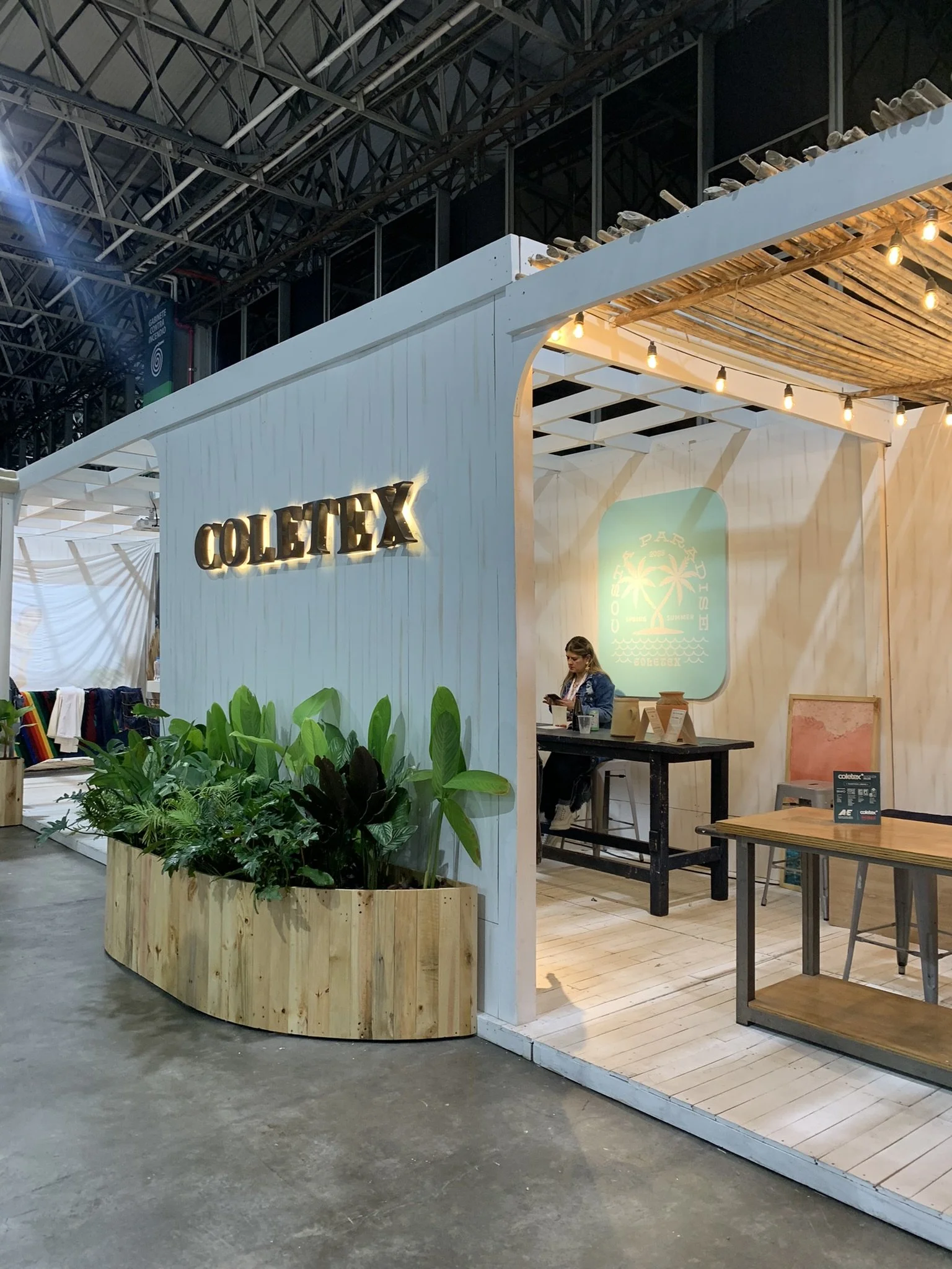 Un stand con aire de “Costa Paradise”: una cabina cálida y veraniega que mezcla madera blanqueada, telas crudas y mucha vegetación tropical para presentar el universo denim de Coletex. El cielo ondulado de yute y las guirnaldas de bombillos crean una luz suave tipo atardecer, mientras el espejo circular y las tablas-gráfica de surf enmarcan la exhibición de telas y prendas. Todo respira artesanía y verano.