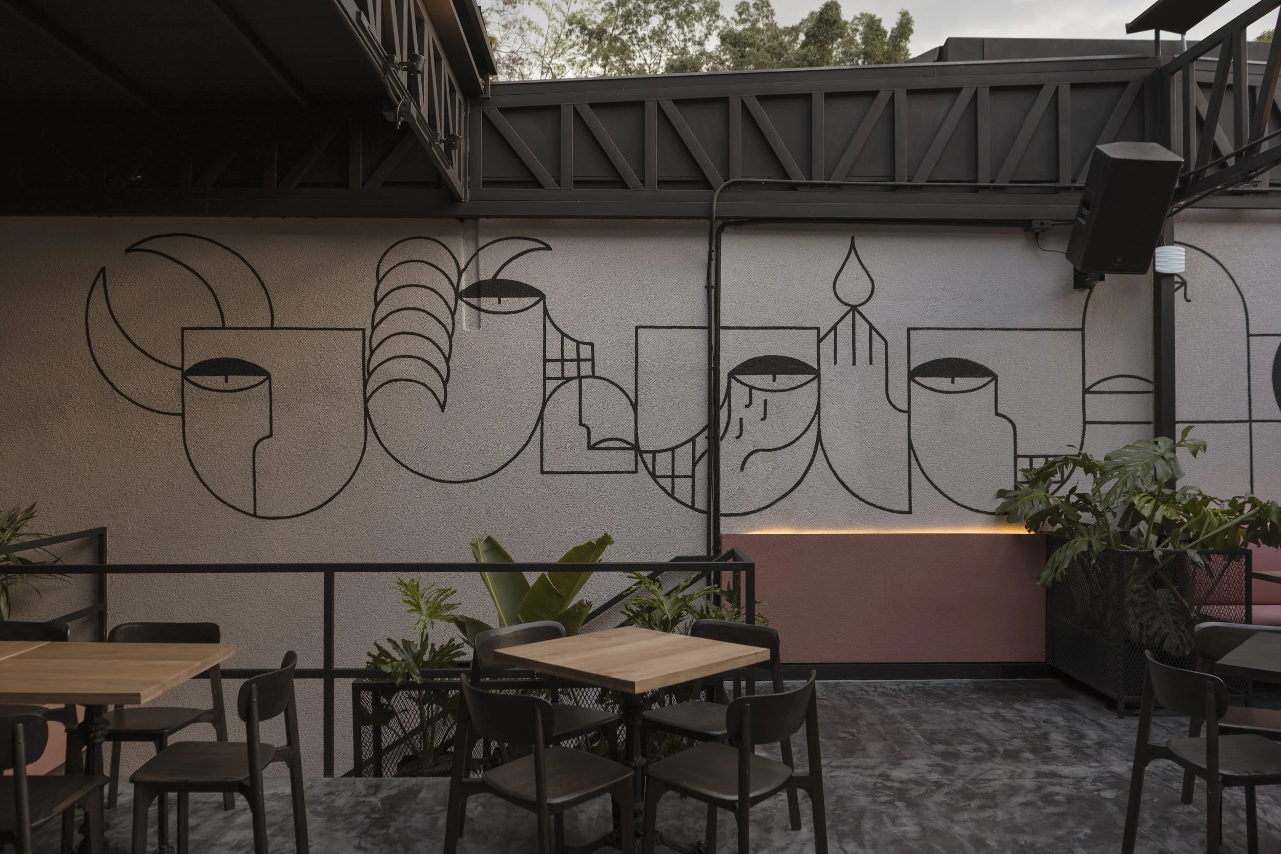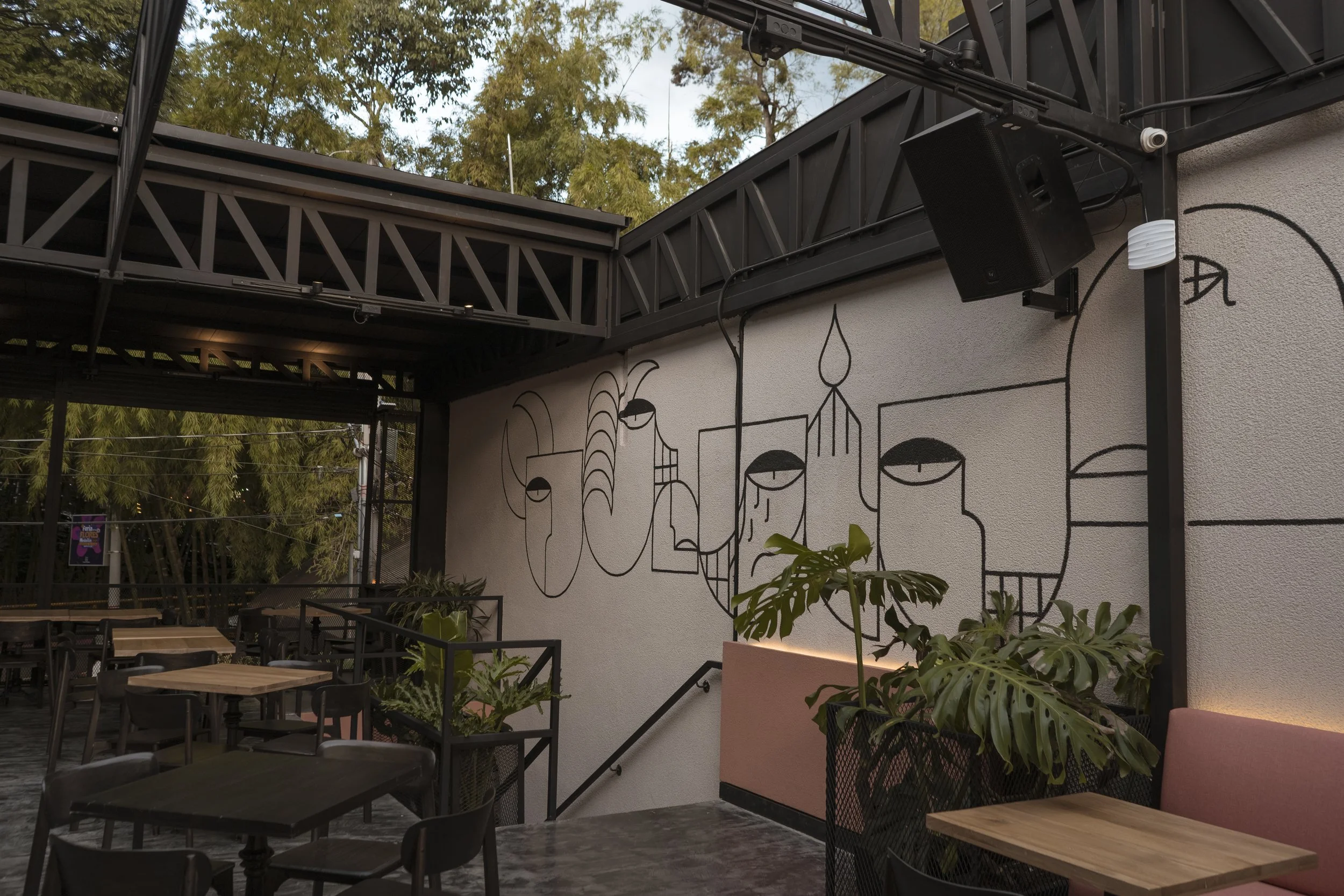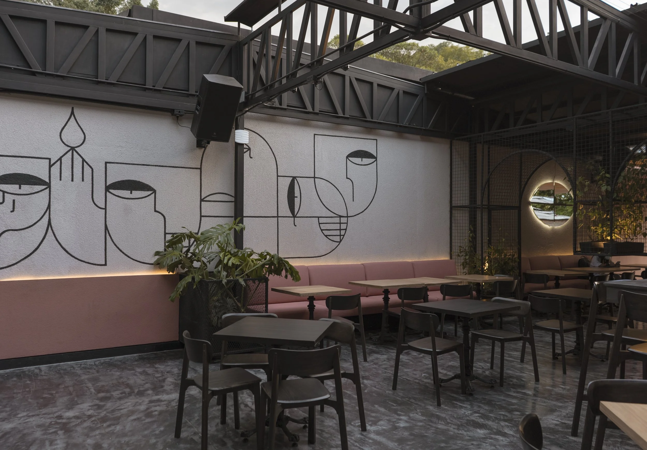 Luno es una terraza-jardín suspendida sobre Provenza. Una estructura metálica vista y cerchas negras sostienen planos de estuco texturizado en coral y marfil, mientras celosías de malla alojan vegetación que tamiza la luz. El piso de microcemento y los bancos tapizados regulan la acústica; un bar monolítico con repisas de acero retroiluminadas marca el corazón del proyecto. La cubierta ligera con toldo retráctil habilita ventilación cruzada y clima amable todo el año. Un mural lineal y apliques circulares de halo cálido completan la atmósfera.