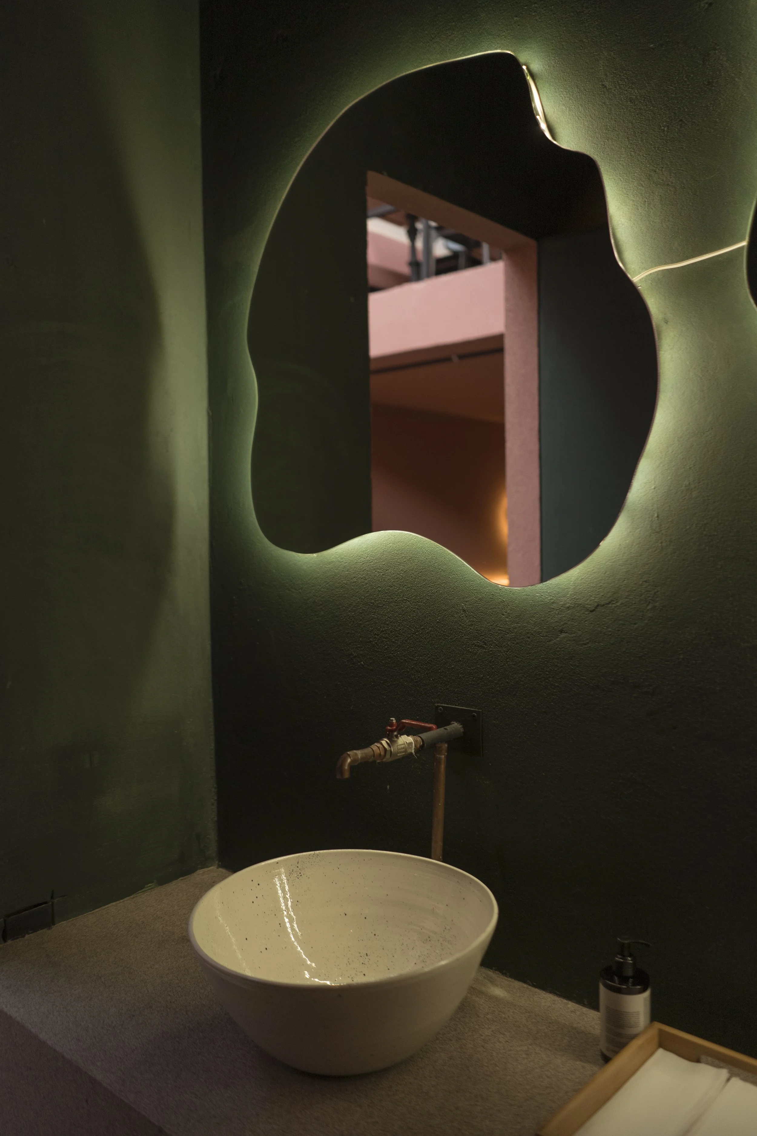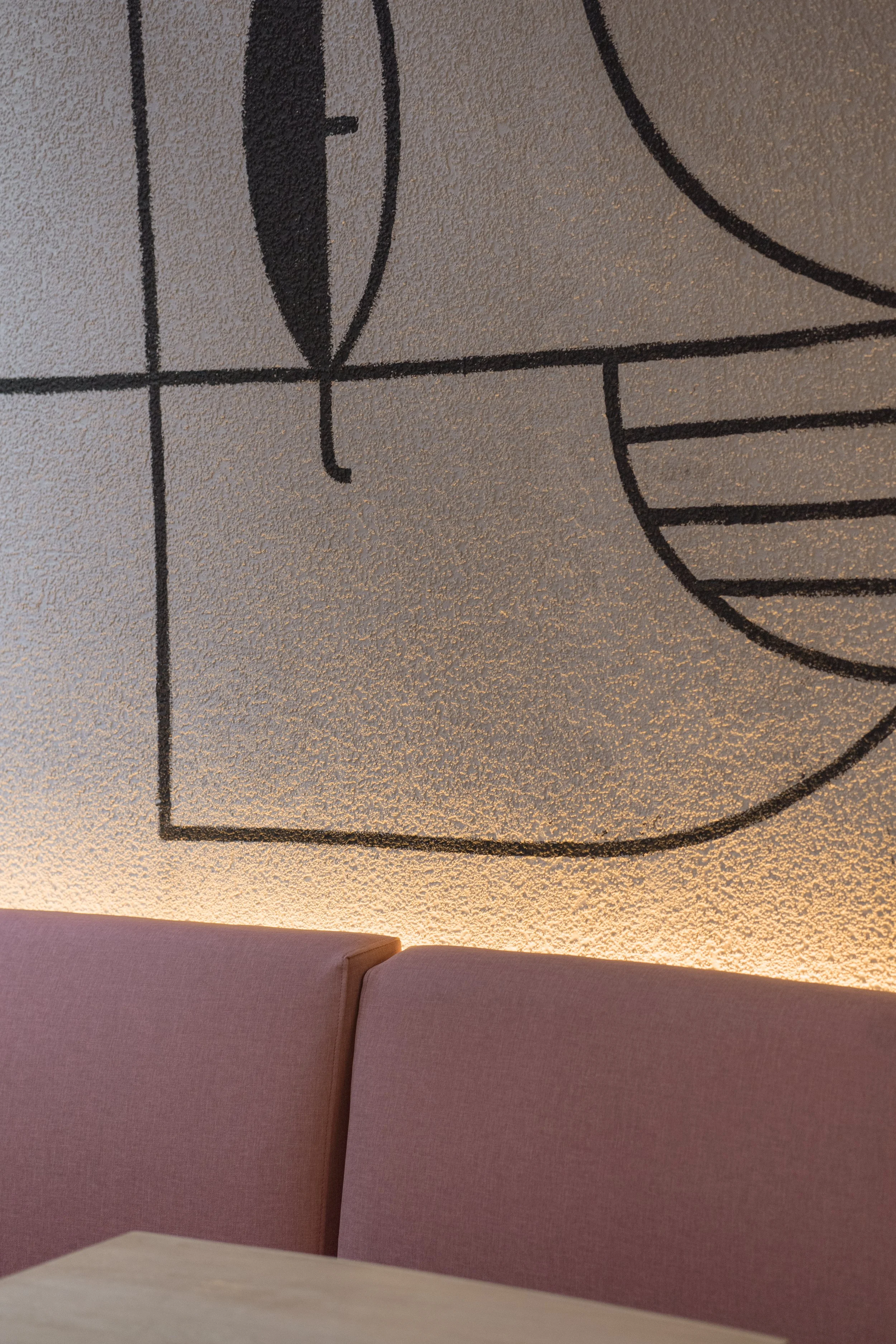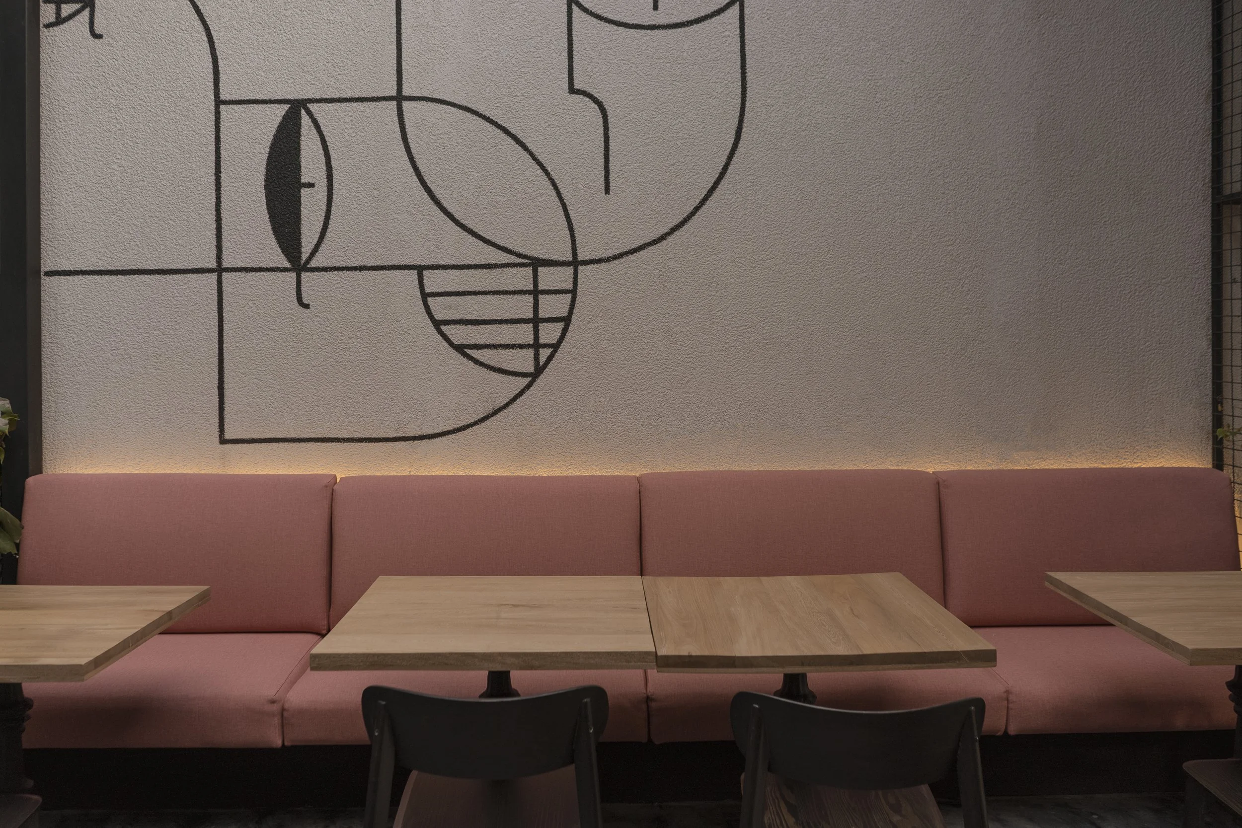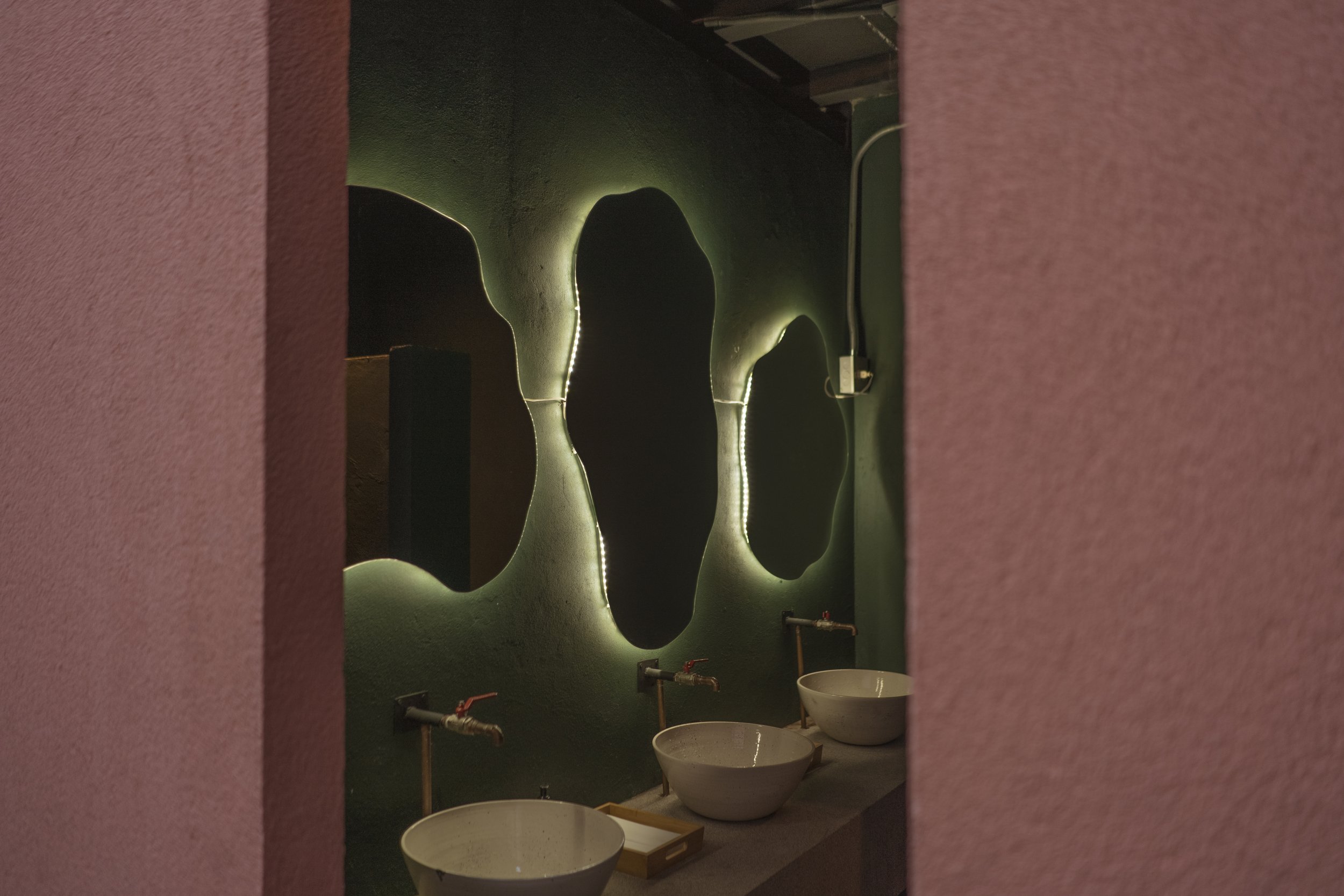 Luno es una terraza-jardín suspendida sobre Provenza. Una estructura metálica vista y cerchas negras sostienen planos de estuco texturizado en coral y marfil, mientras celosías de malla alojan vegetación que tamiza la luz. El piso de microcemento y los bancos tapizados regulan la acústica; un bar monolítico con repisas de acero retroiluminadas marca el corazón del proyecto. La cubierta ligera con toldo retráctil habilita ventilación cruzada y clima amable todo el año. Un mural lineal y apliques circulares de halo cálido completan la atmósfera.