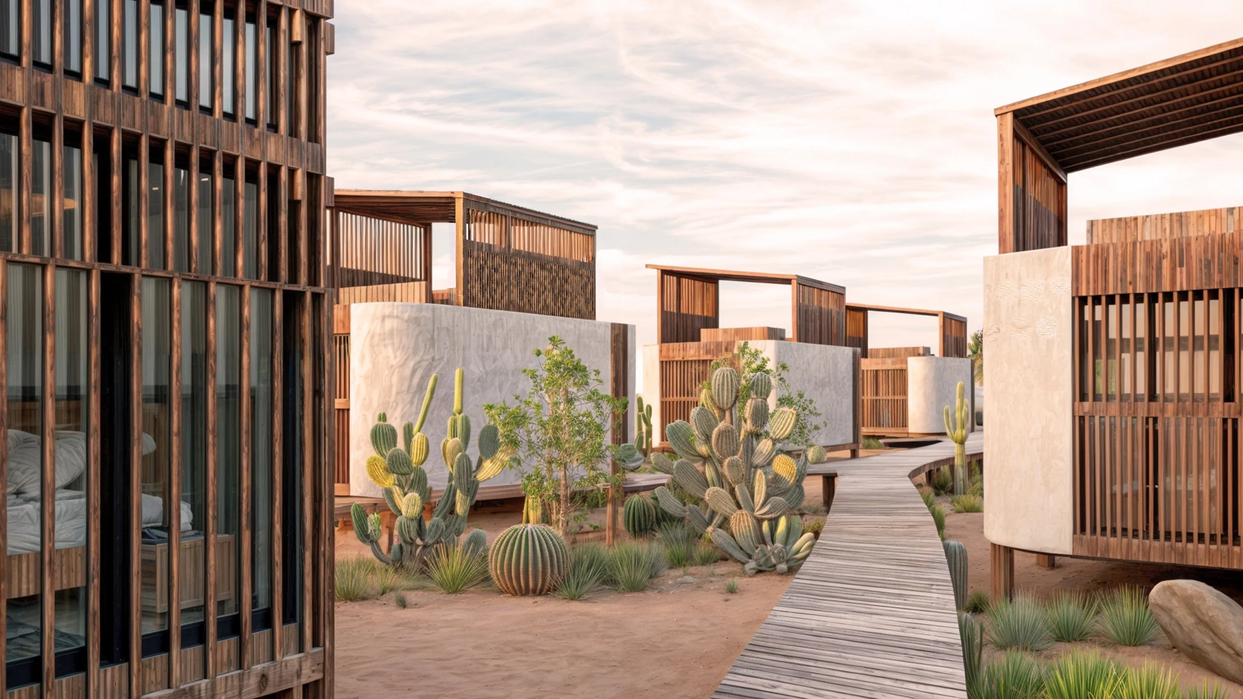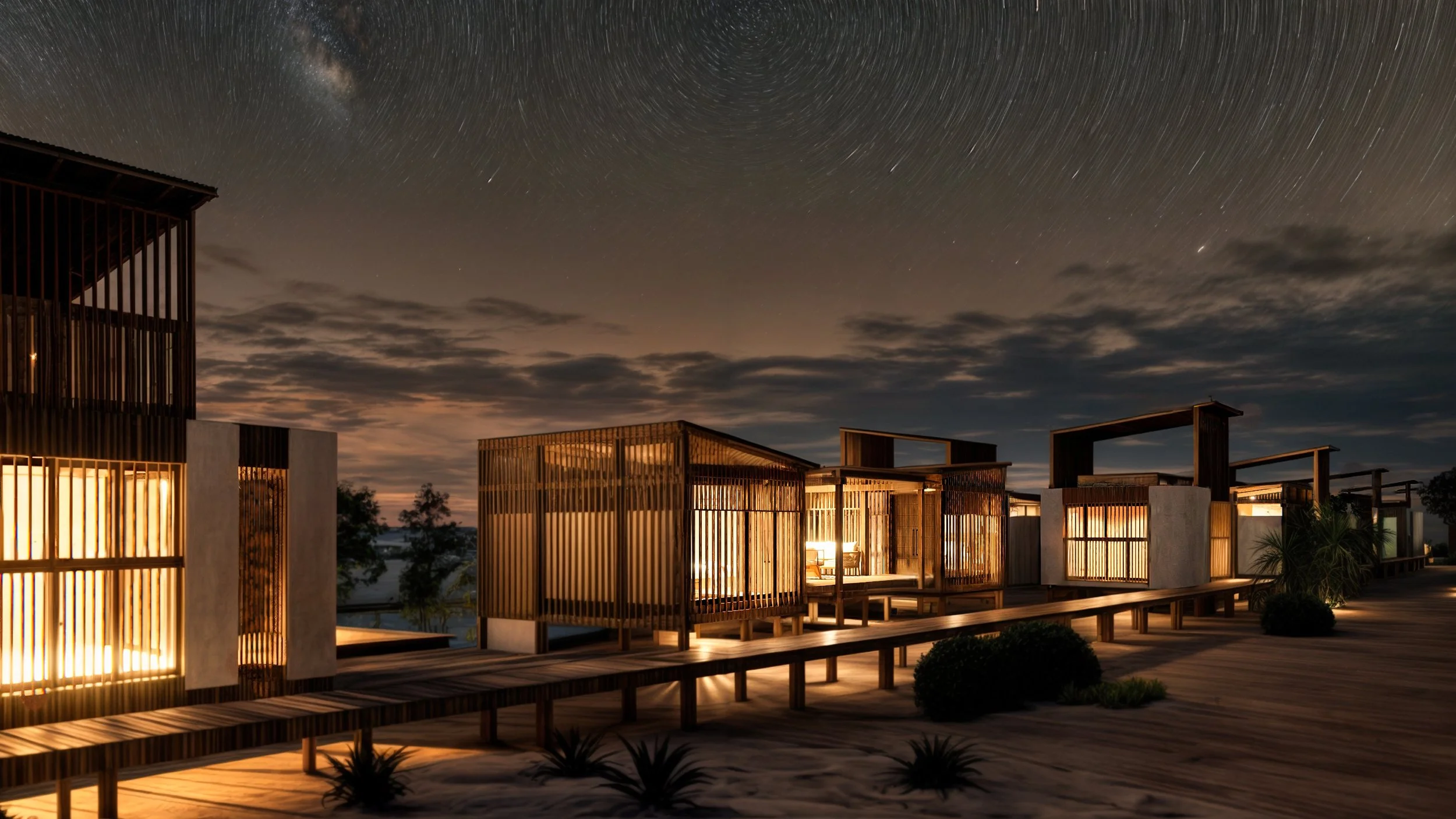Mareata Sunset es un refugio en medio del desierto guajiro, donde la arquitectura se integra con el paisaje de arena y mar. El proyecto está compuesto por módulos independientes en concreto y madera, diseñados para brindar sombra, ventilación natural y privacidad, mientras enmarcan las vistas hacia el horizonte.