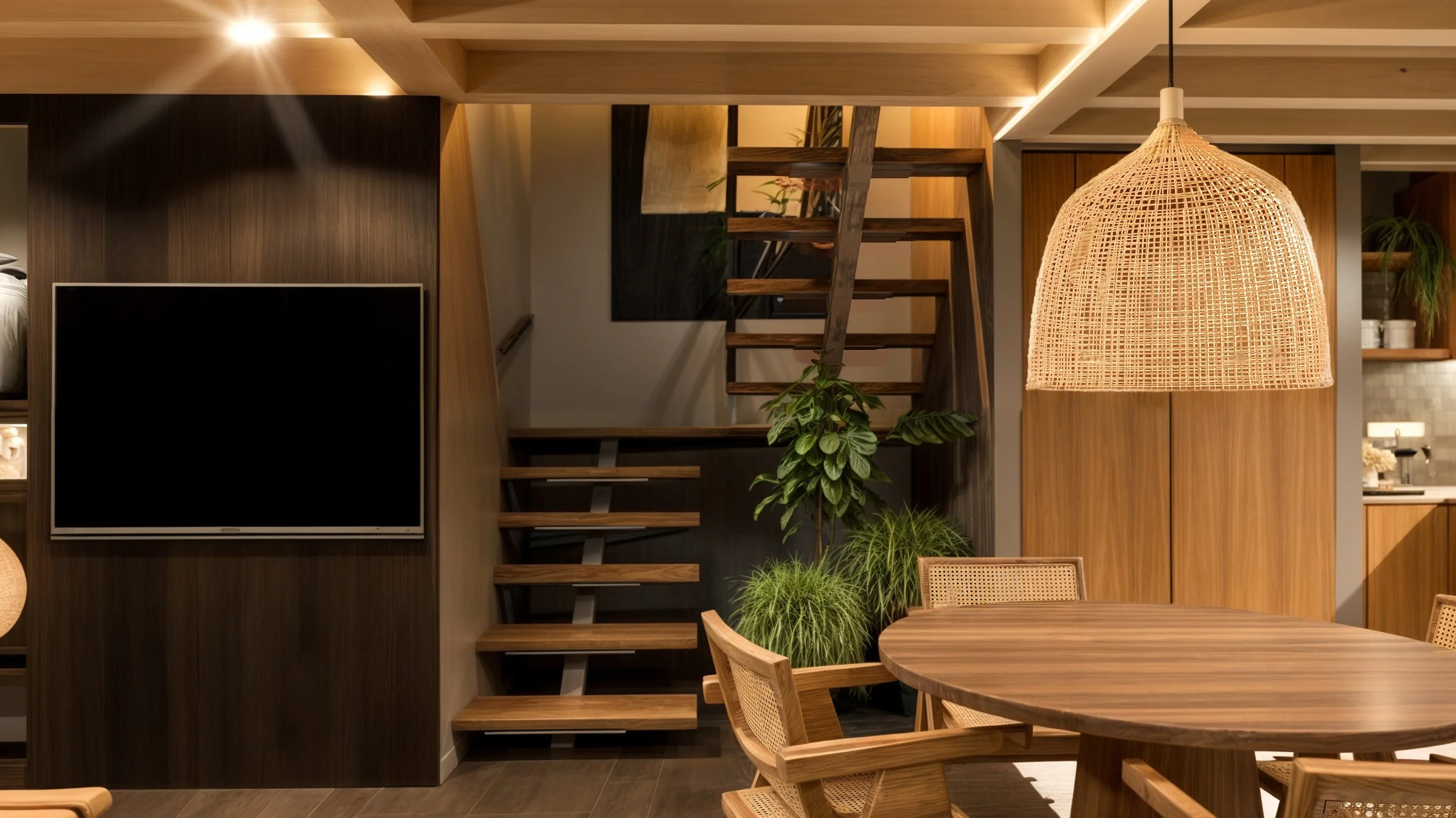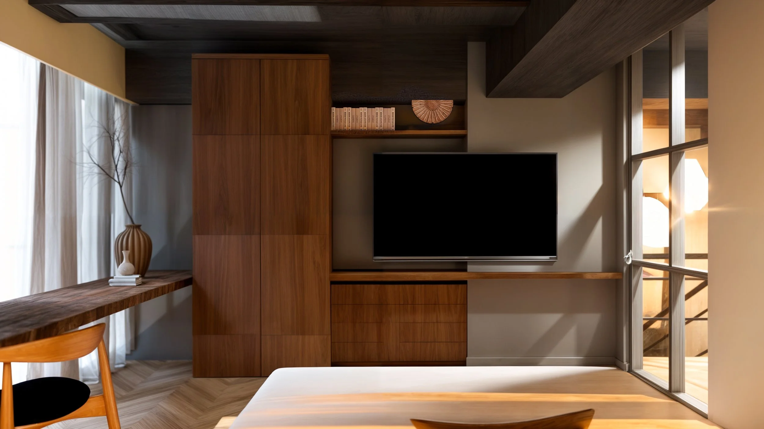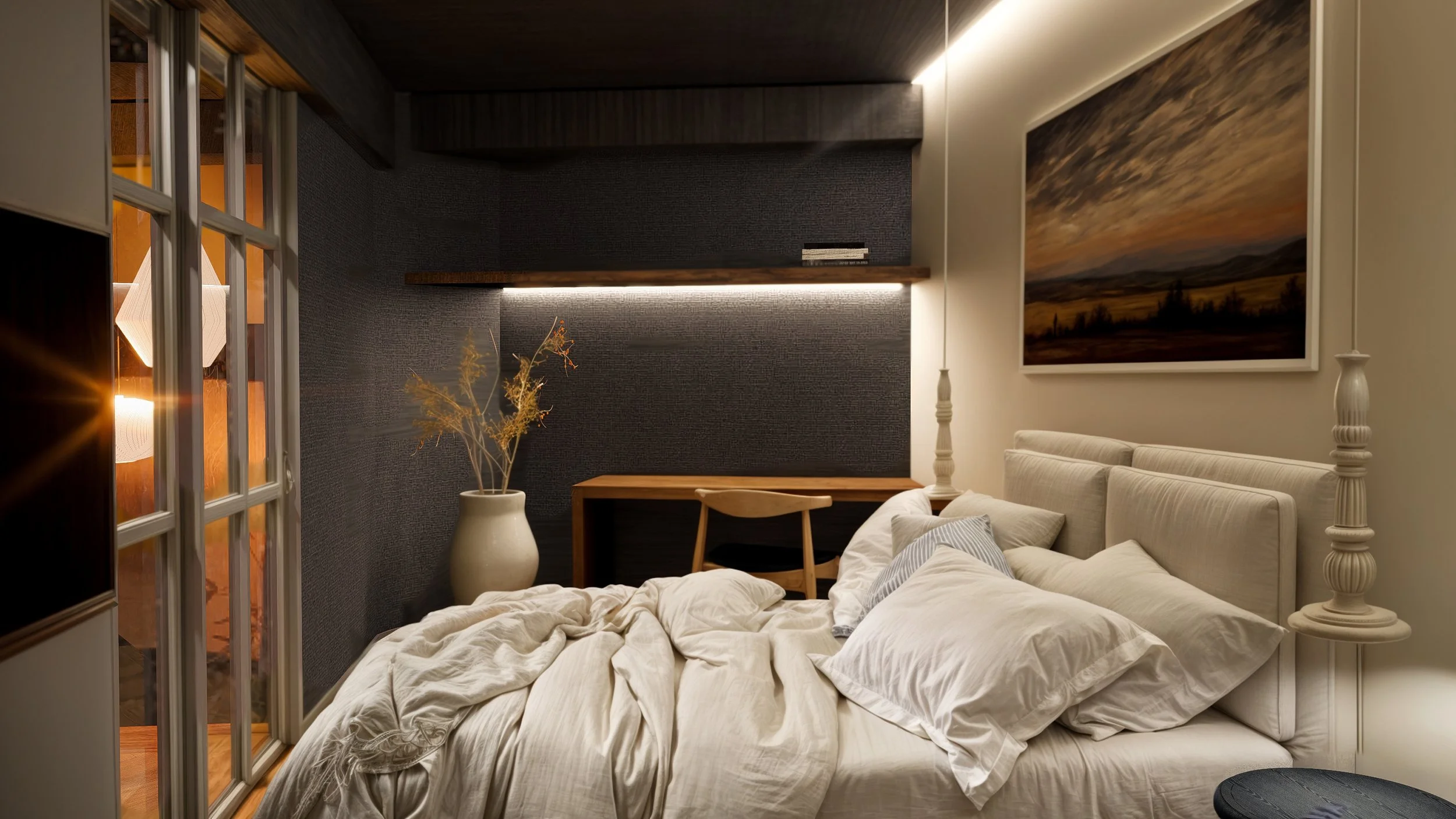 Apartamento de renta corta diseñado para ser cálido, fotogénico y resistente: planta social abierta con sala, comedor y cocina integrados; muros de ladrillo, cielorrasos en madera y vegetación que crean atmósfera acogedora. Mobiliario a medida en maderas y fibras naturales, iluminación regulable y acabados de alto tráfico facilitan la operación. La habitación incorpora escritorio panorámico y almacenamiento oculto para optimizar metros y confort del huésped. Ideal para estancias breves con experiencia de hotel boutique